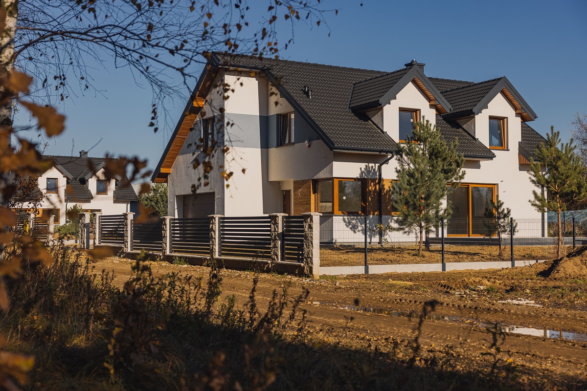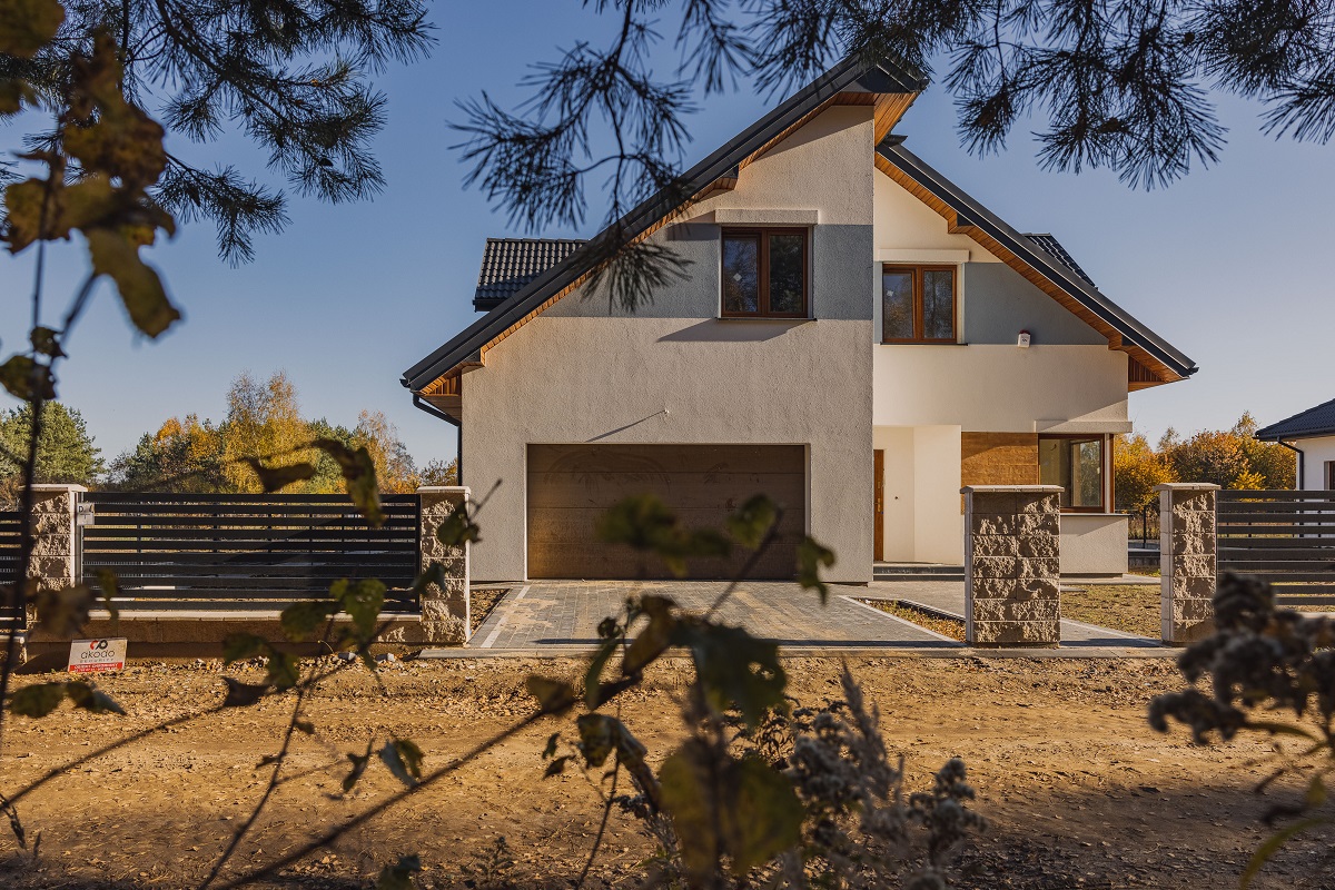 Domy wykonane są zgodnie z najwyższymi standardami i z wysokiej jakości materiałów. Zarówno na etapie projektowania, jak i wykonania zadbaliśmy o każdy szczegół. Starannie dobrana lokalizacja pozwala na mieszkanie i wypoczynek w zaciszy lasu, zachowując wygodę i bliskość infrastruktury miejskiej – przy lesie, cisza, spokój, ale jednocześnie dobry i szybki dojazd do Warszawy (22 km do Centrum). W odległości 500 m zlokalizowany jest przystanek autobusowy, a ok. 1,5 km przystanek SKM i KM, która w 30 min dojeżdża do Warszawy na Dworzec Centralny.